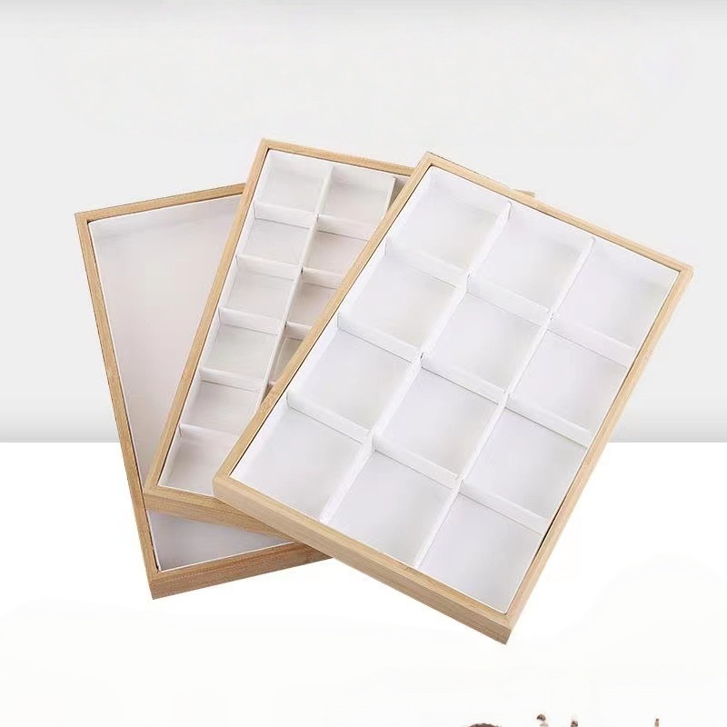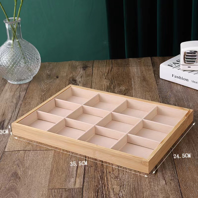 Bandeja expositor organizador de bambu 35.5cmX24.5cmX3cm, con 12 ranuras.